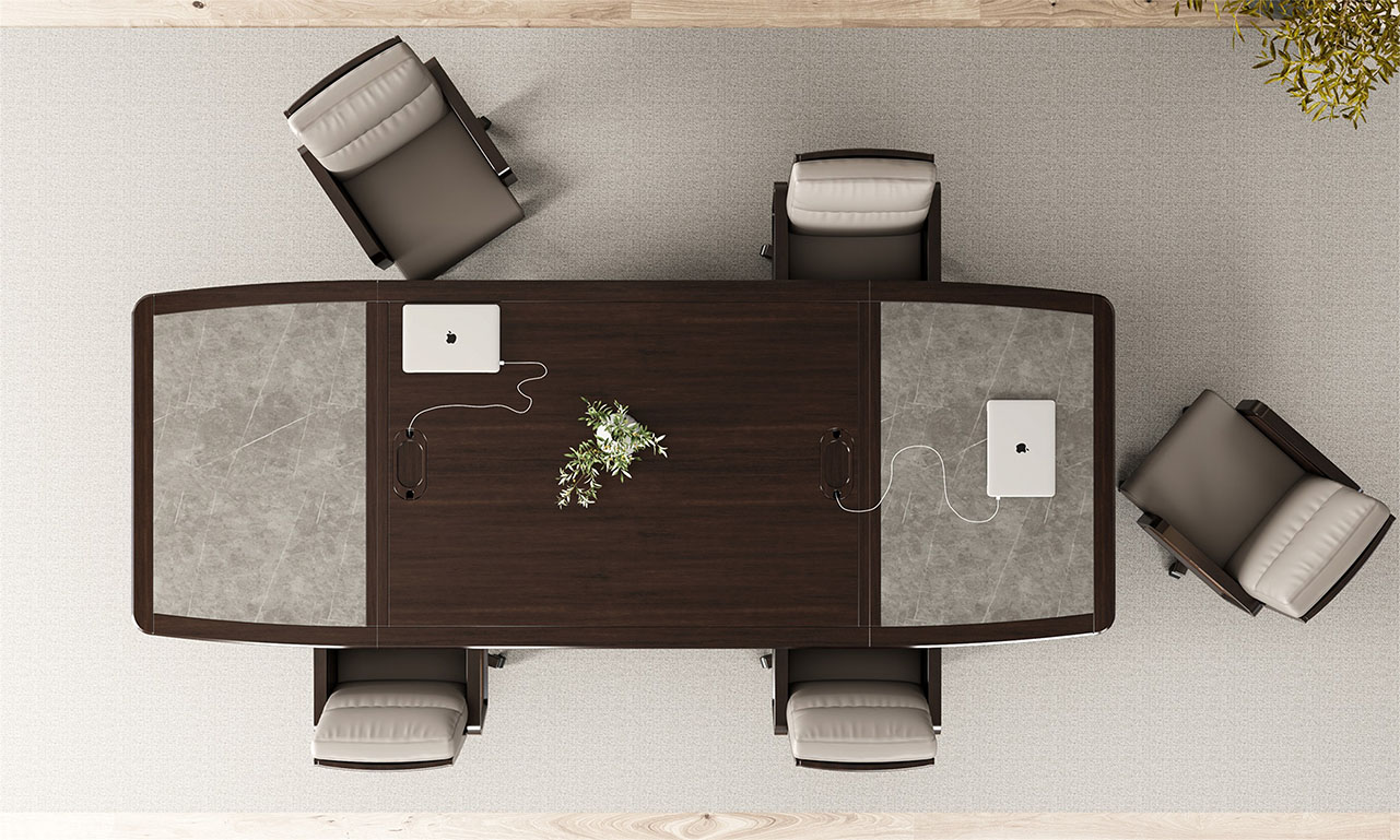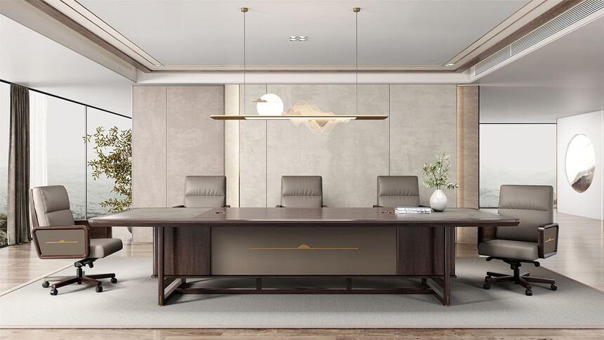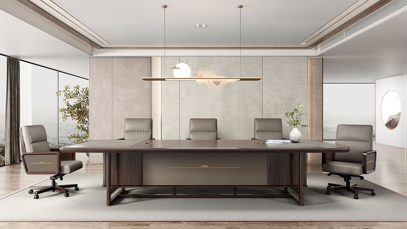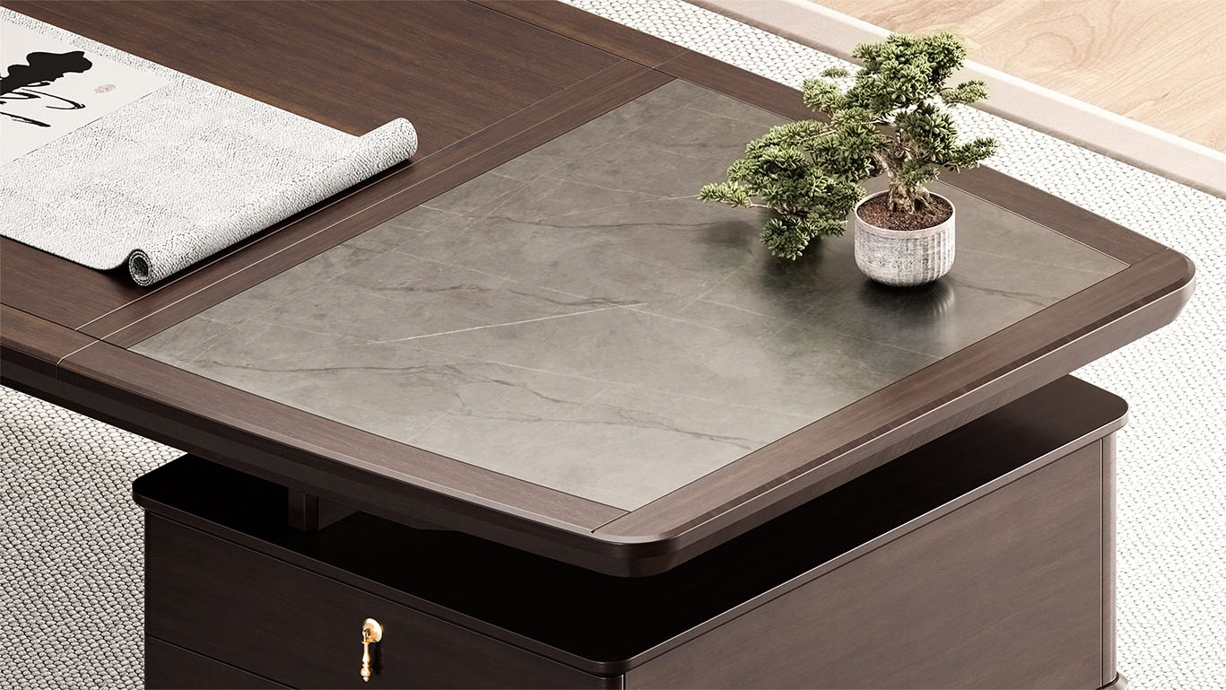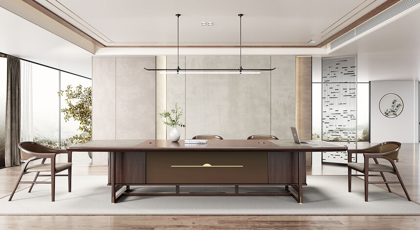 鴻泰系列是一款新中式風格的辦公家具,設(shè)計靈感源于中式傳統(tǒng)裝飾紋樣“回”字形,因其形式回環(huán)反復,延綿不斷,在民間有“富貴不斷頭”的說法,有連綿不斷、吉利長久的吉祥寓意,在造型上主要采用硬朗簡潔的直線條,溫潤的烏金木與質(zhì)樸的巖板相結(jié)合,剛?cè)岵瑫r尚大方,既使得中式家具古典、質(zhì)樸的內(nèi)涵顯現(xiàn),又符合現(xiàn)代辦公追求的時尚感、實用性。