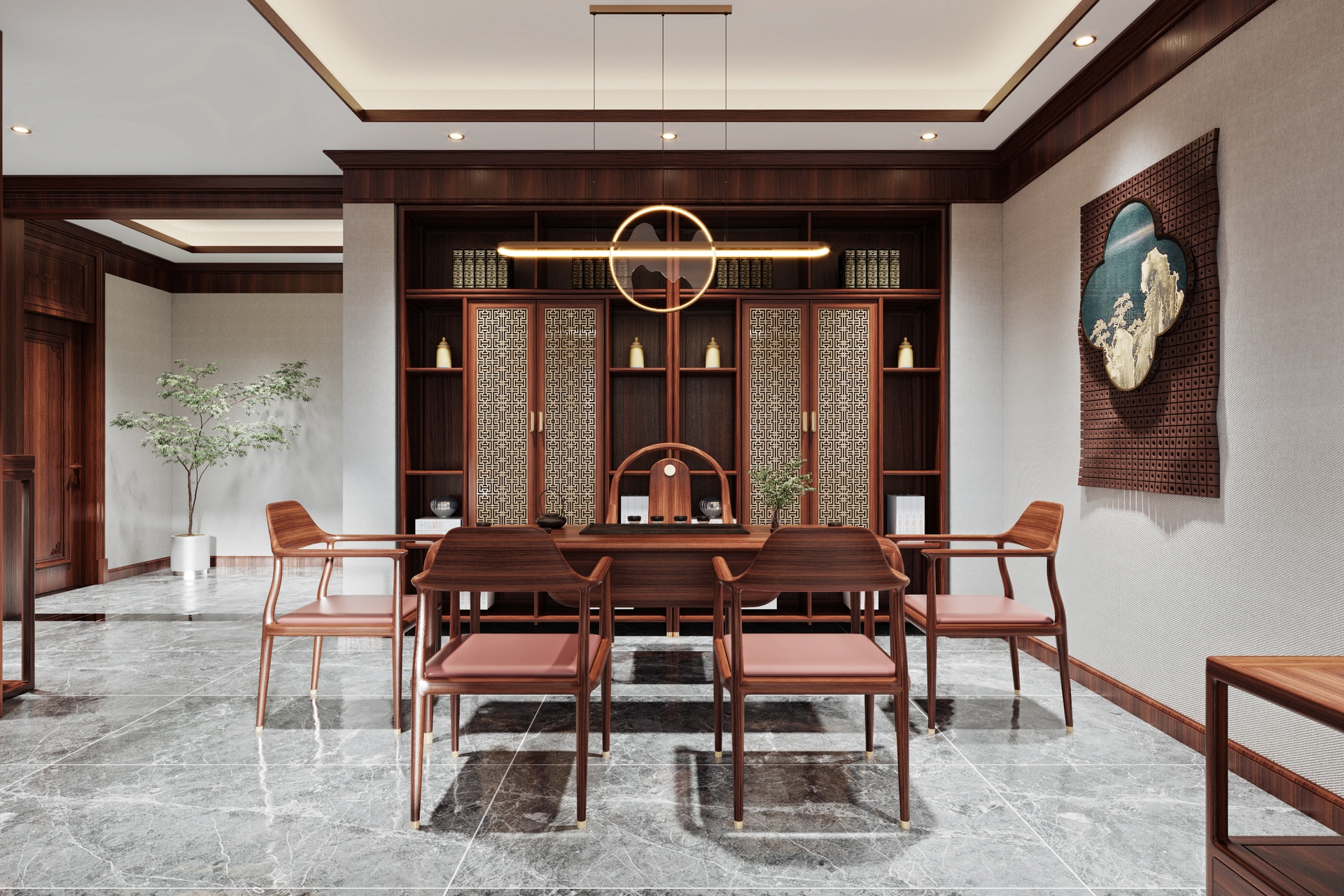 此外,庭院與書房是中式別墅的獨特空間,傳統(tǒng)的圈椅、博古架、花幾等家具與綠植、假山相得益彰,形成一幅優(yōu)美的生活畫卷。整體而言,新中式家具不僅傳承了傳統(tǒng)文化,還完美契合了現(xiàn)代人的生活需求,使中式別墅煥發(fā)出獨特的藝術(shù)魅力與生活品質(zhì)。