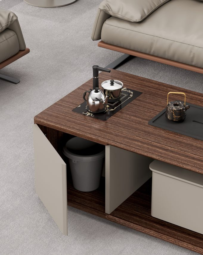 五金配件:博格維斯品牌緩沖導(dǎo)軌、NOVEI緩沖門(mén)鉸;臺(tái)面配黑拉絲走線盒。