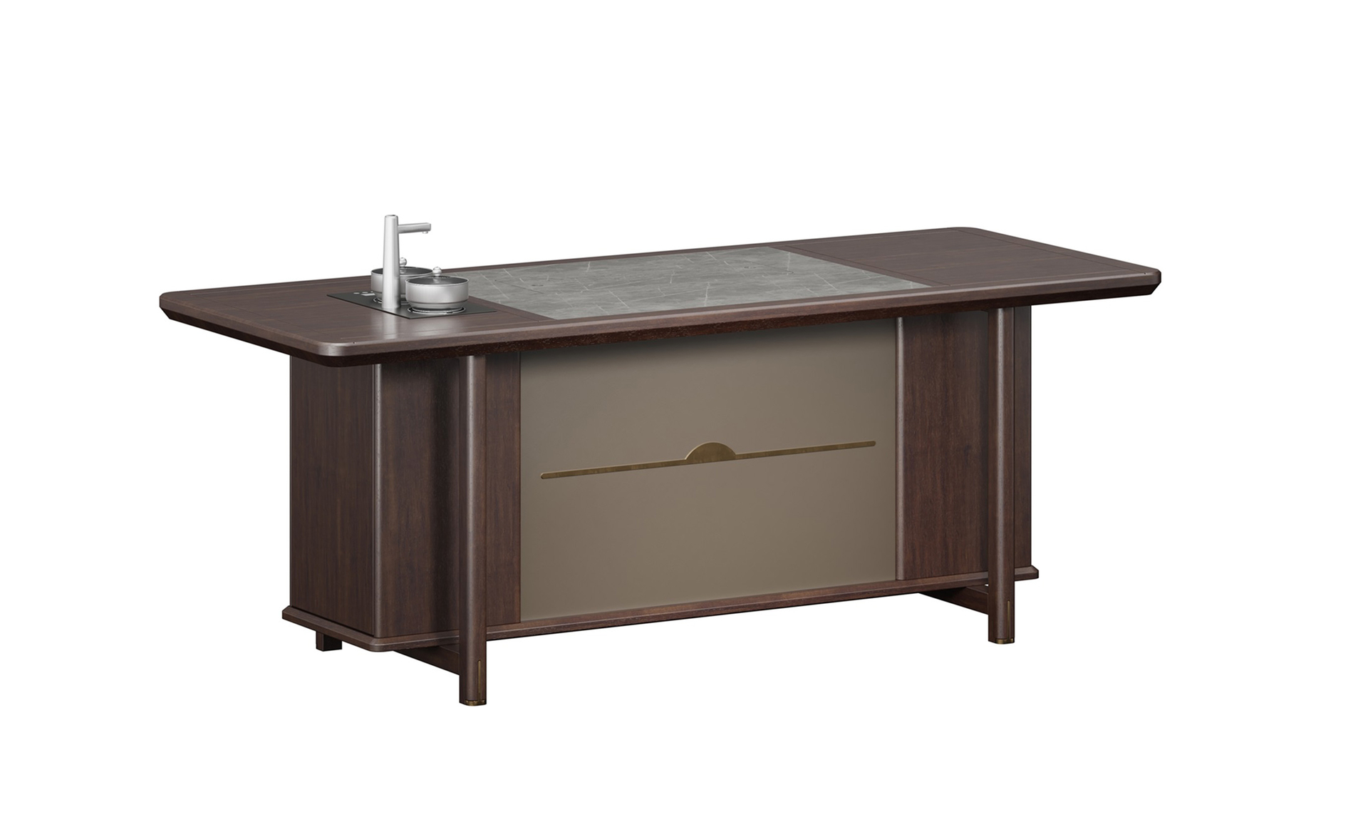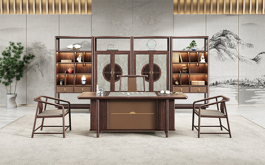 鴻泰系列在造型上主要采用硬朗簡潔的直線條,溫潤的烏金木與質(zhì)樸的巖板相結(jié)合,剛?cè)岵?jì),時尚大方,既使得中式家具古典、質(zhì)樸的內(nèi)涵顯現(xiàn),又符合現(xiàn)代辦公追求的時尚感、實用性。
