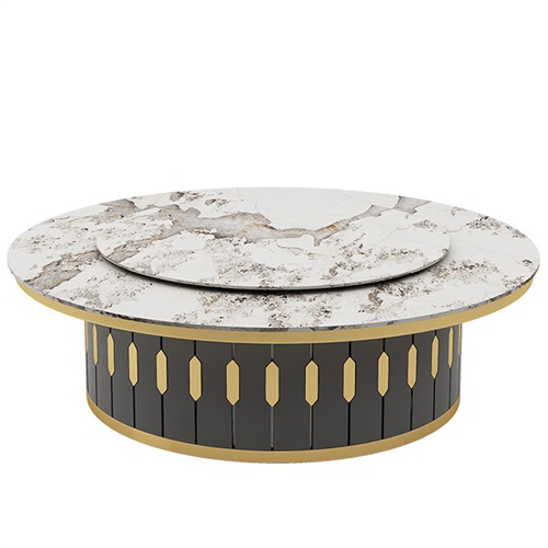 會所酒店包廂宴會自動旋轉(zhuǎn)巖板電動餐桌大圓桌造型美觀、外形可人,或雍容華貴或典雅高潔,是接待客人、酒店用餐的理想產(chǎn)品。本款電動餐桌桌面采用巖板,高品質(zhì)五金框架,高硬度巖板轉(zhuǎn)盤
