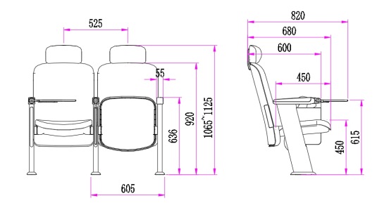2.座椅基本中心距為525±5mm,座包打開側深680±5mm,寫字板打開側深820±5mm,基本椅高不帶頭枕為920±5mm、帶頭枕為1065~1125±5mm,最小排距:850mm。