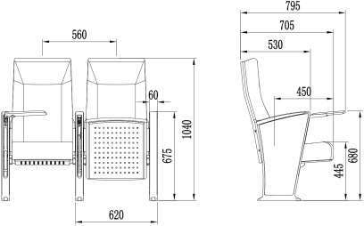 2.座椅基本中心距為:560±10mm,座包打開側深為:705±10mm,寫字板打開側深為:795±10mm,椅高為:1040±10mm,最小排距:900mm。